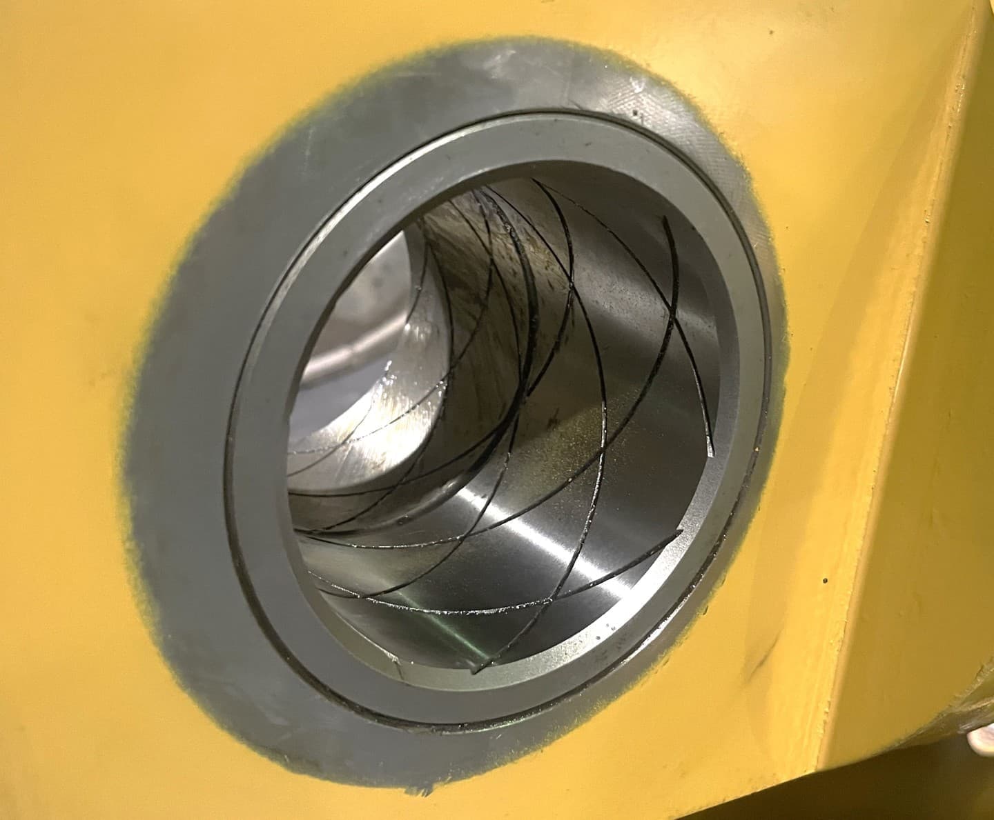 シリンダブッシュも修理頻度の多い部品です。LS1500では破砕力が増えた分、ブッシュの材質を特殊鋼に改良し、更に肉厚も増やしました。他社にはない細かな油溝にも注目です。 |